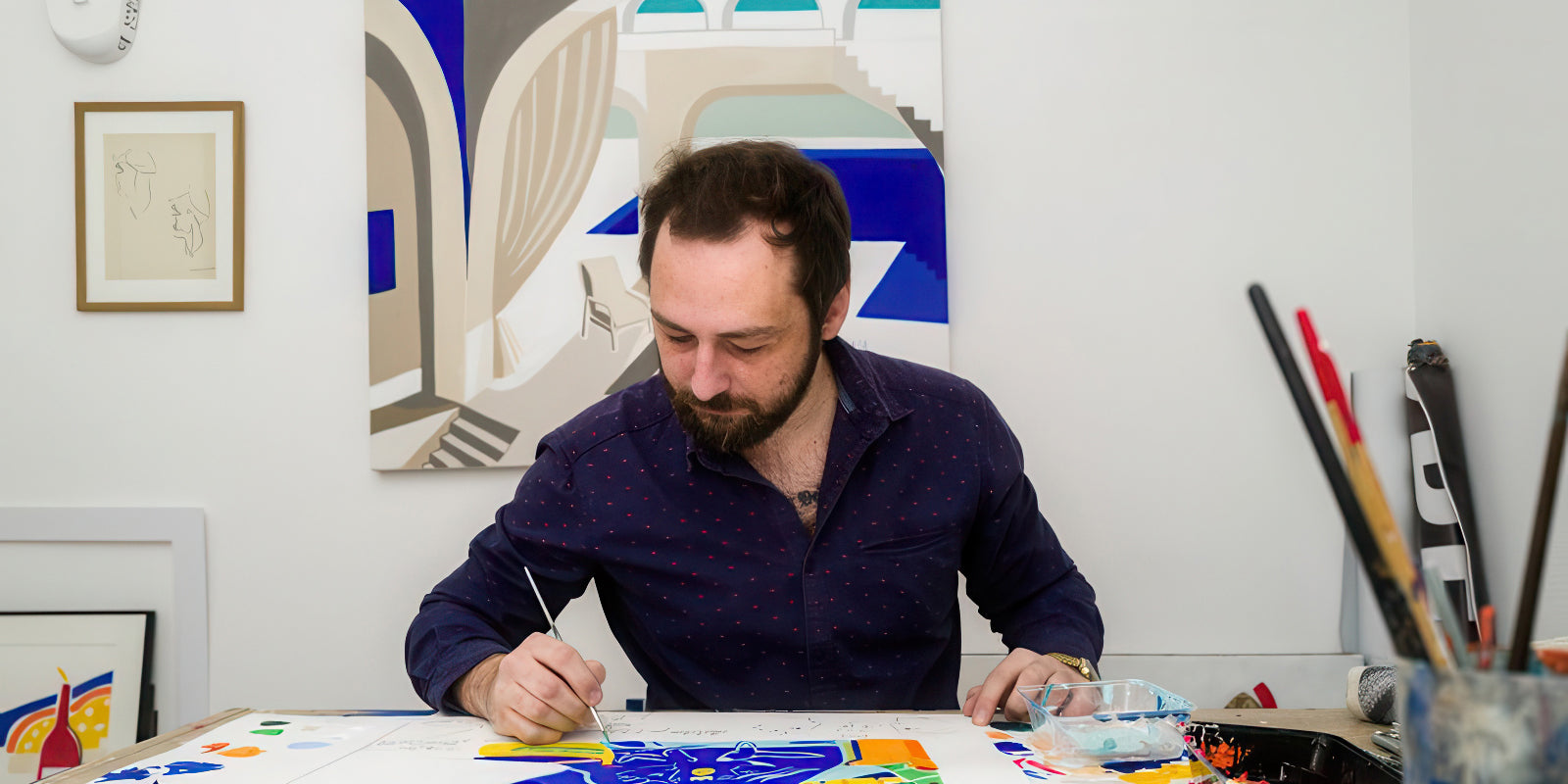 Son travail joue subtilement avec les contrastes, mêlant lignes graphiques et touches oniriques.